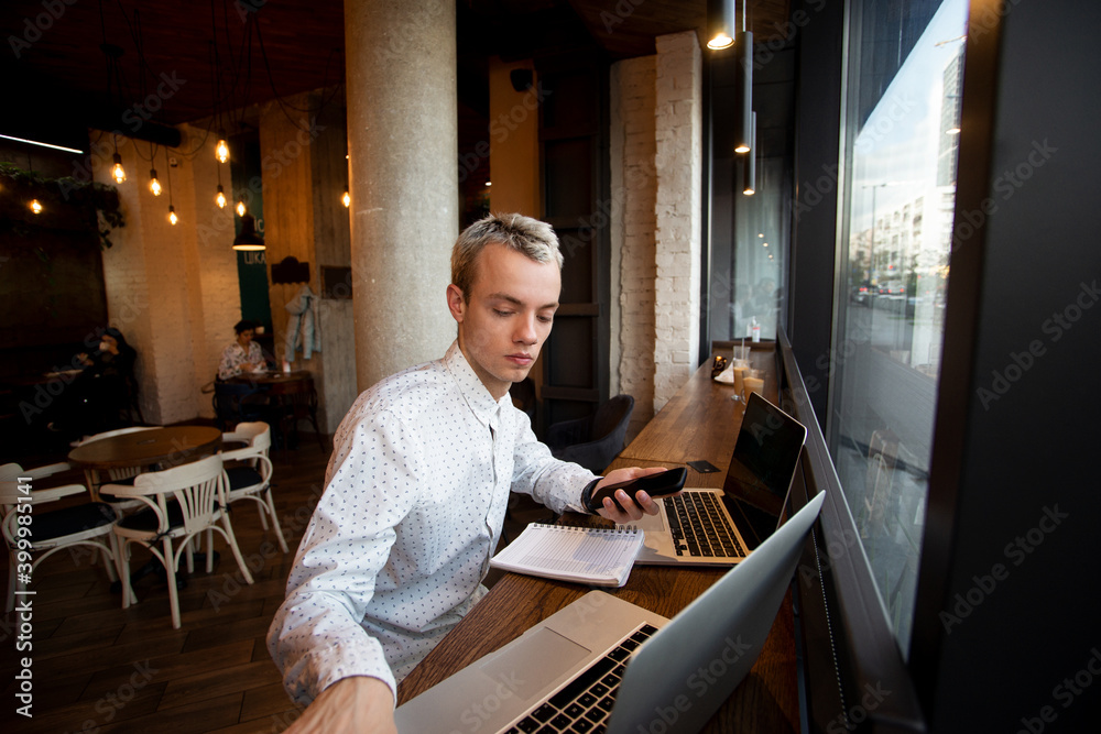 Freelance Programmer Sits Near The Window In A Coffee Shop And Works Stylish Blonde Man In White Shirt Uses Laptops Cozy Coffee Shop Atmosphere Cafe Or Restaurant On Background Stock Photo